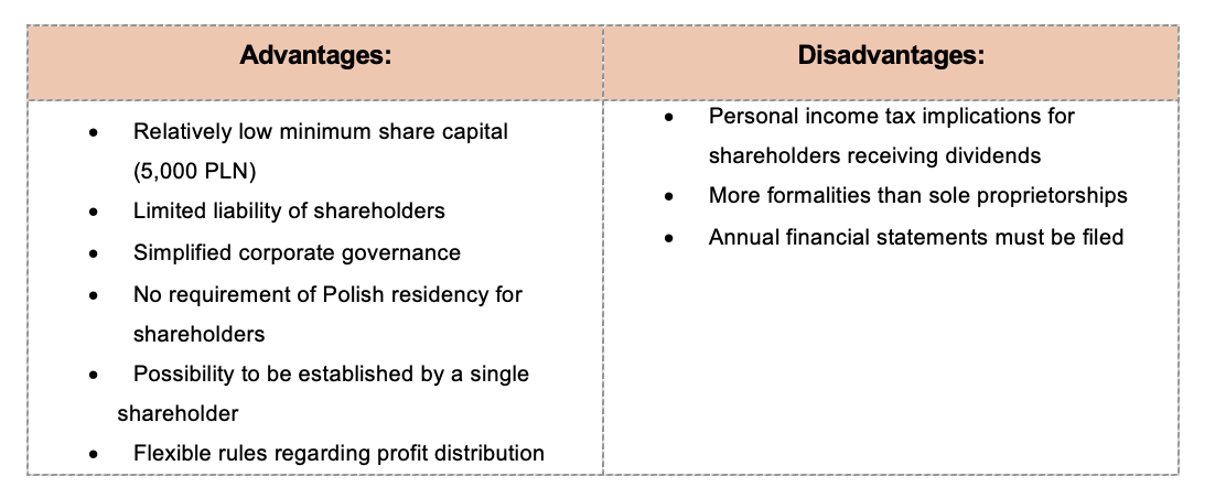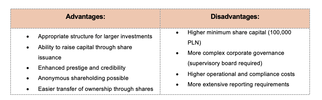 The spółka akcyjna is a less common choice for typical real estate investments. Incorporation and governance requirements are more complex – for instance, a higher minimum capital and more formalized management structure (management board and supervisory board) are required. Using an S.A. is generally “unusual” for real estate entry vehicles, unless the investor plans to raise capital publicly or undertake a very large venture.